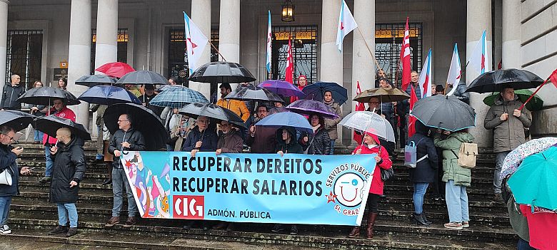 A CIG-Administración continuou hoxe coa campaña para reclamar a recuperación de dereitos laborais e salariais do persoal empregado público, que nos últimos sete anos perder máis do 20% do seu poder adquisitivo. Delegados/as da central sindical desenvolveron unha concentración na Subdelegación do Goberno español en Pontevedra ás 11:00 horas en demanda de medidas que revertan o empobrecemento dos salarios, como un incremento de soldos do 5% para este ano, incorporar cláusulas de garantía salarial e a xornada laboral de 35 horas á semana.