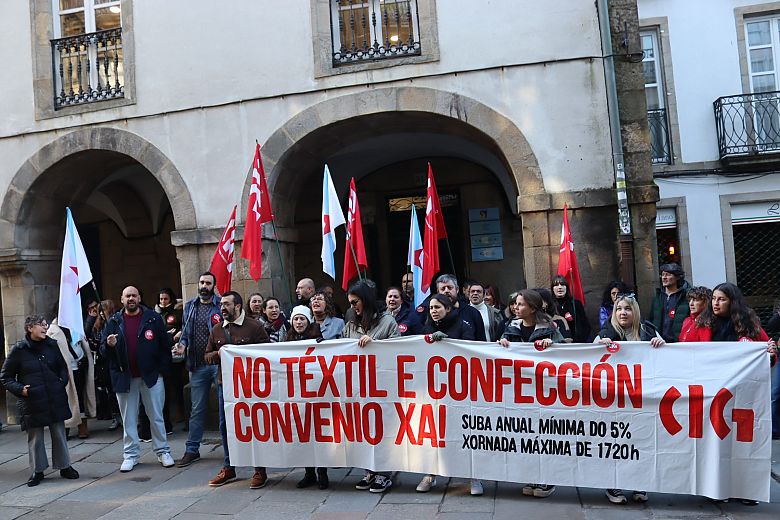 Delegadas e delegados do sector téxtil concentráronse esta mañá diante da sede da Confederación de Empresarios de Galiza (CEG) para exixir que se retomen as negociacións do convenio colectivo, que atinxe a arredor de 10.000 traballadoras galegas -son maioritariamente mulleres- e que están paralizadas desde o pasado día 16 de outubro.