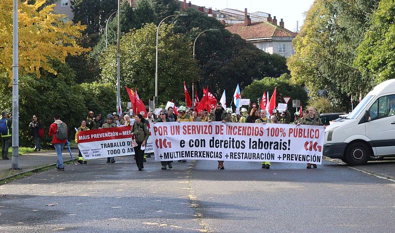 Persoal de Prevención e Extinción de Incendios Forestais da Xunta volveu mobilizarse este luns para reclamar un servizo 100% público e único, no que todo o persoal teña as mesmas condicións laborais, se lle garanta a súa saúde e seguridade, que dispoña de dignidade salarial e que traballe todo o ano nas multiemerxencias e colabore na restauración das zonas queimadas.