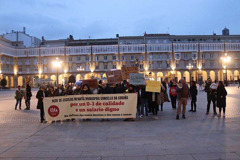 Traballadoras da rede de escolas infantís municipais 0-3 do Concello da Coruña concentráronse na tarde deste martes na Praza de María Pita, ante a falta de resposta por parte do Goberno local ás demandas para atallar a precariedade laboral e salarial que padecen e mellorar a atención ás crianzas.